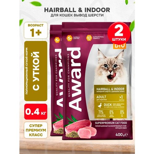 Сухой корм AWARD Hairball & Indoor для взрослых кошек для выведения шерсти с уткой и индейкой с добавлением зеленой чечевицы и Юкки Шидигера.
