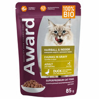 AWARD Полнорационный консервированный корм «Hairball & Indoor» для выведения шерсти у взрослых домашних кошек, кусочки в соусе с уткой 85 г 24 шт.