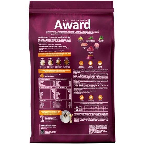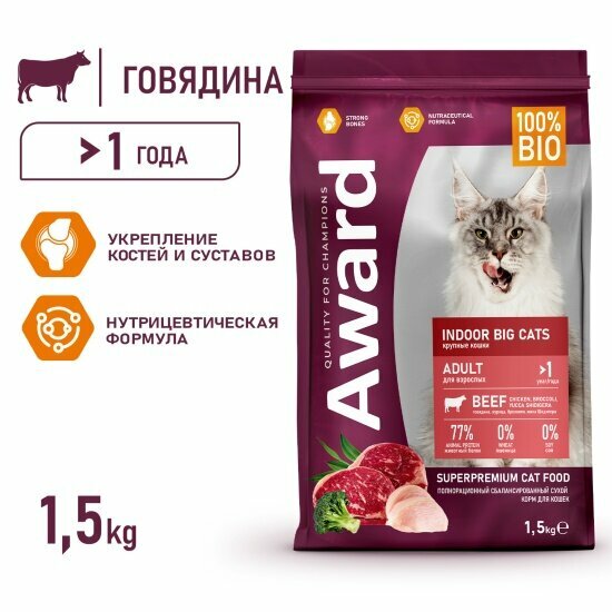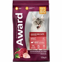 Сухой корм AWARD Indoor Big cats для взрослых домашних кошек крупных пород с говядиной и курицей с добавлением брокколи и юкки Шидигера 1,5 кг