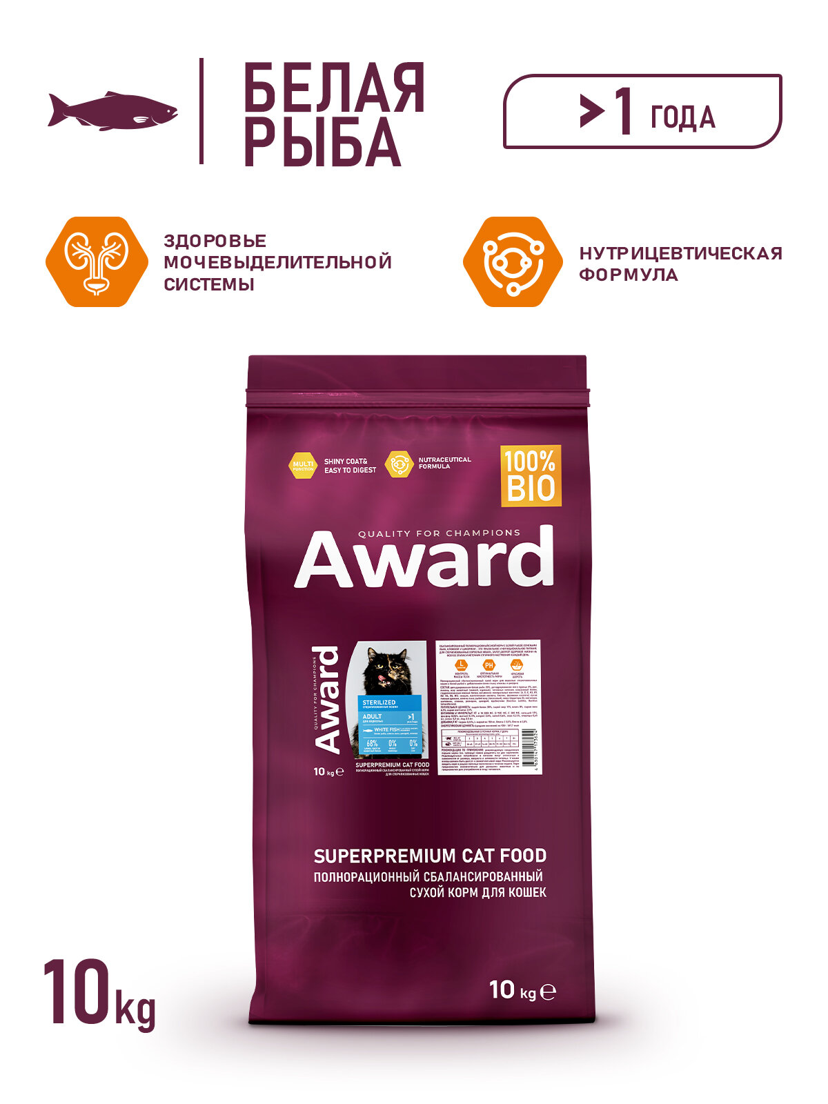 Сухой корм AWARD Sterilized для взрослых стерилизованных кошек с белой рыбой с добавлением семян льна, клюквы и цикория 10 кг