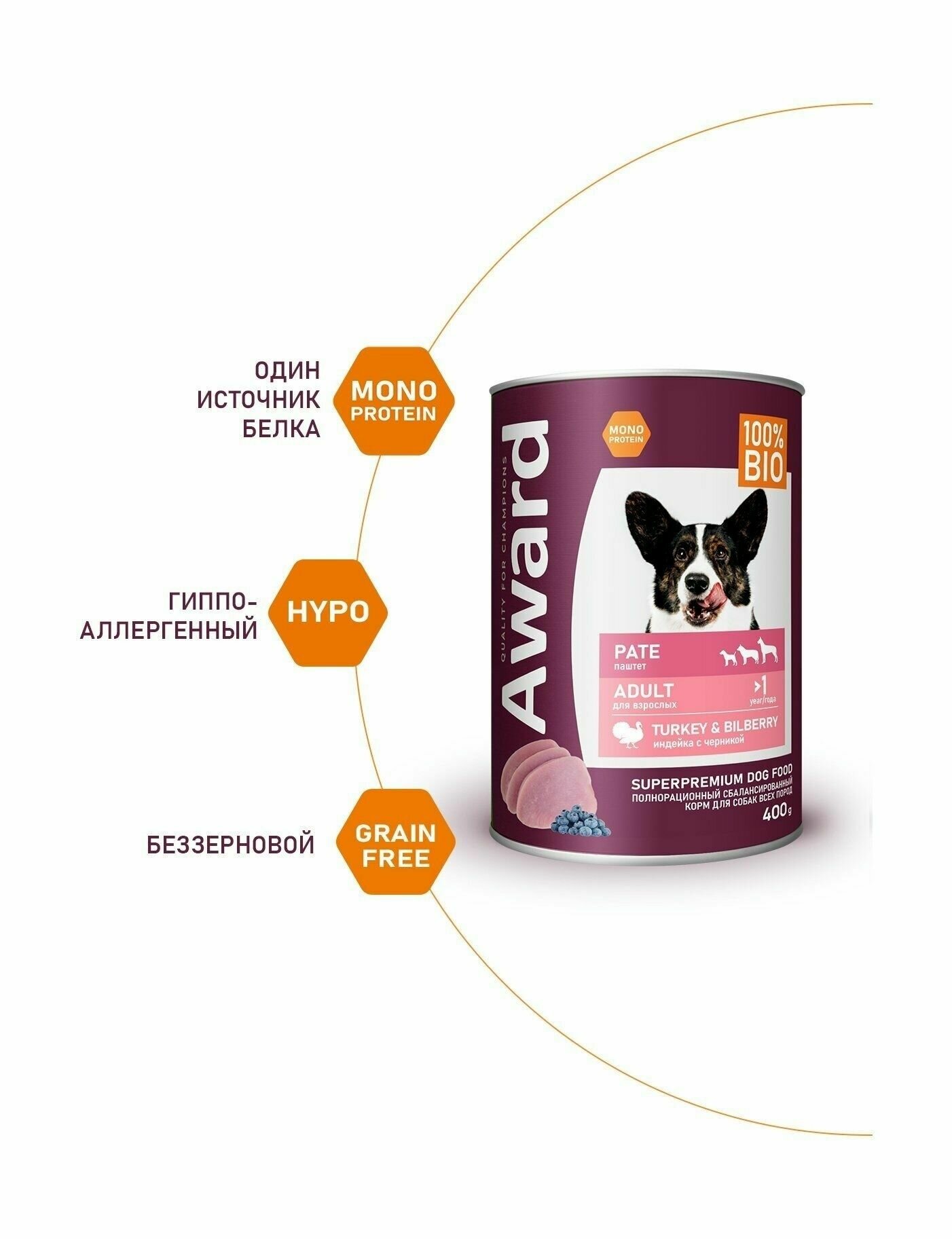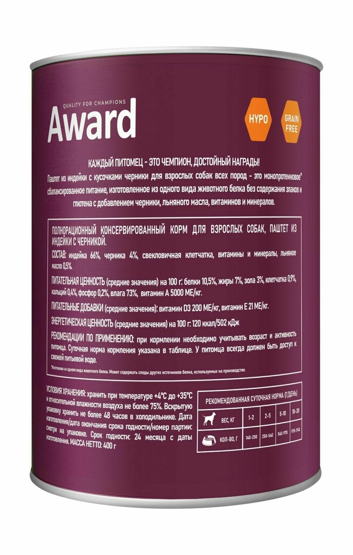 Влажный корм Award для взрослых собак паштет из индейки с черникой 400гр (упаковка 12шт): сравнение цен, характеристики, фото, актуальное наличие и цены.