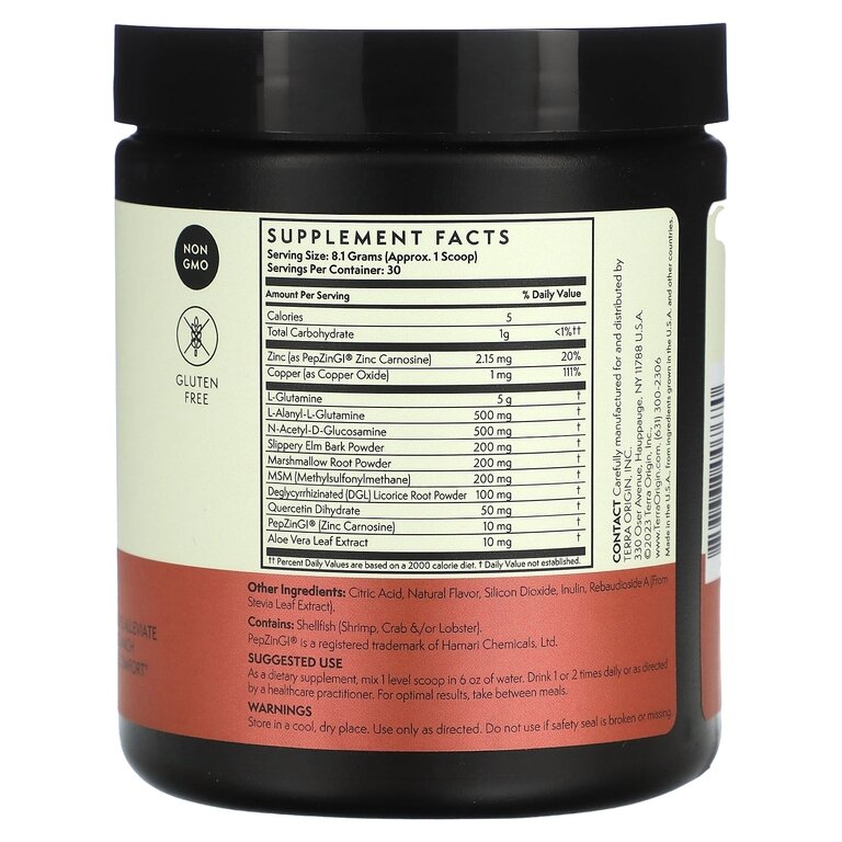Цинк (в виде карнозина цинка PepZinGI), Медь (в виде оксида меди), глютамин, L-аланил-L-глютамин, N-ацетил-D-глюкозамин, Порошок из коры красного вяза, Порошок из корня алтея, Метилсульфонилметан (МСМ), Глицирризинат (DGL) порошка корня солодки, Экстракт листьев стевии, Дигидрат кверцетин, PepZinGI (карнозин цинка), Экстракт листьев алоэ вера
