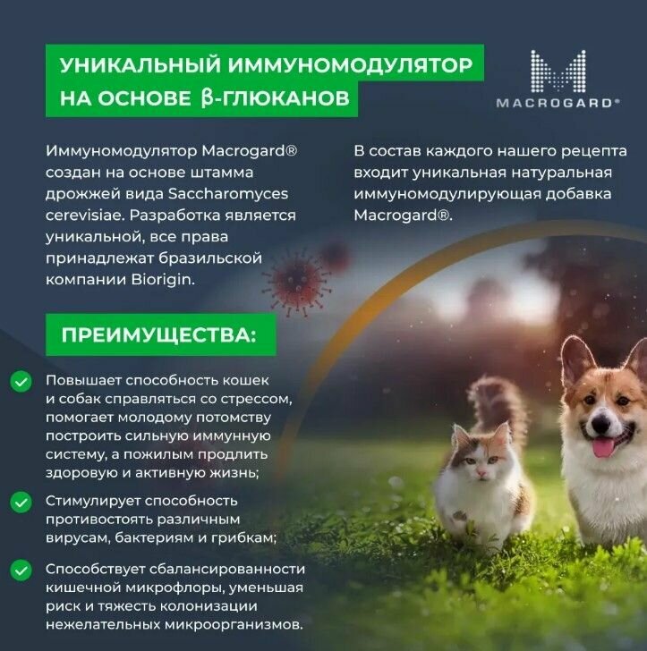 Дегидрированное мясо курицы (34%), цельнозерновой рис, маис, протеин растительного происхождения, пульпа сахарной свеклы, жир куриный, гидролизованная и дегидратированная куриная печень, витаминно-минеральный премикс (витамины: А, В4, Е, D3, В3, С, В1, В5, В2, В6, В9, К3, В7, В12; минералы: калий, железо, цинк, марганец, медь, йод, селен), дегидрированное яйцо, семена льна, дрожжи (источник MOS), клюква, L-лизин, таурин, антиоксидант, L-карнитин, пребиотик MacroGard (источник β-глюканов), яблоки сушеные, экстракт розмарина (природный антиоксидант и натуральный консервант), экстракт фенхеля (источник витаминов, микро- и макроэлементов), экстракт морских водорослей (фукус), экстракт Юкки Шидигера.