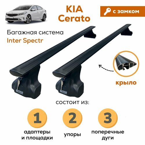 Комплект багажника Inter Spectr с замком крыло Black 120см для Kia Cerato (Киа Церато), на гладкую крышу с креплением за дверной проем (4 опоры с замками+ 4 адаптера+2 крыловидные дуги черного цвета)