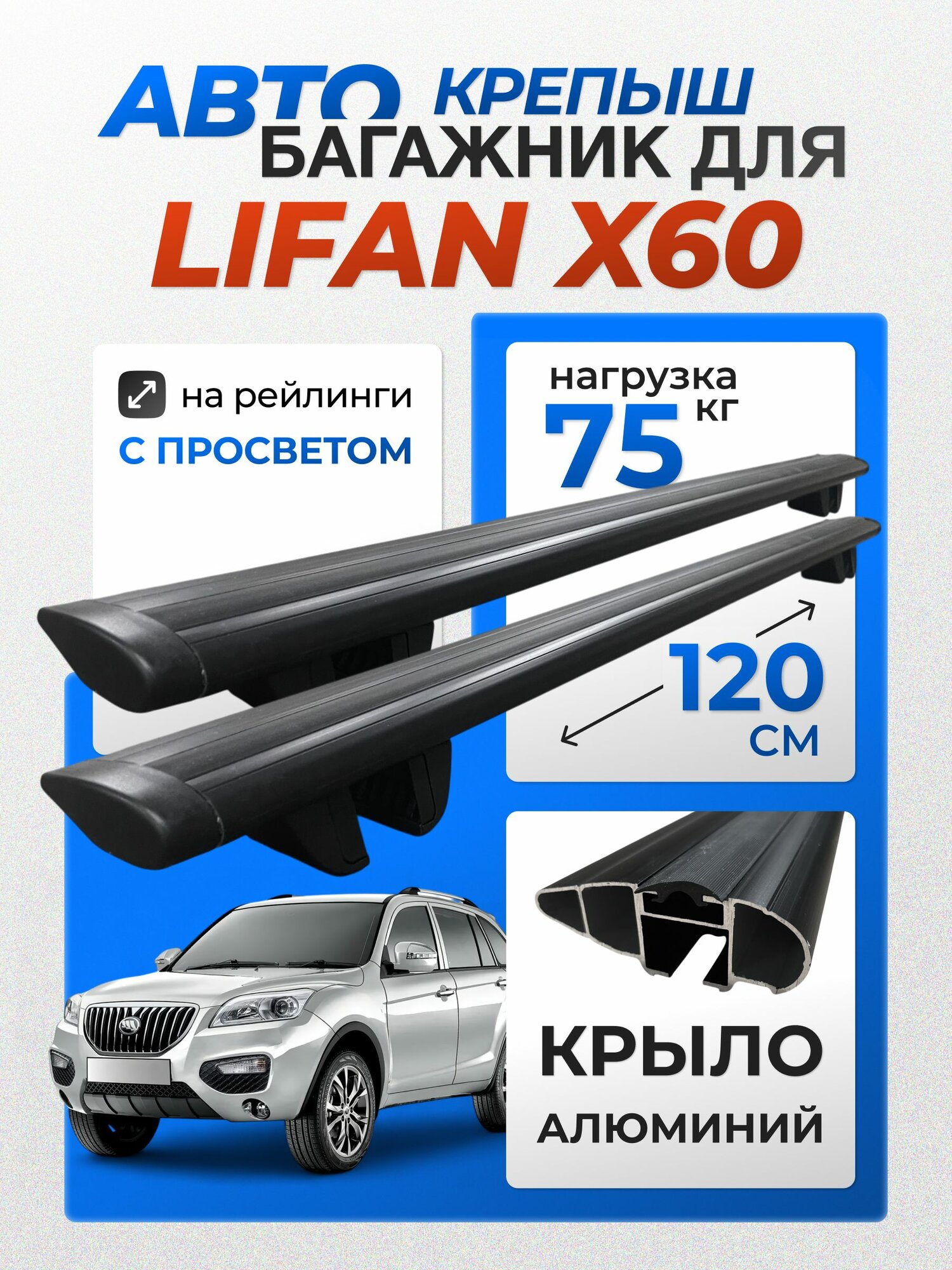 Багажная система, Lifan X60 (Лифан Х60) с рейлингами, состоит из 4-х пластиковых опор и 2-х поперечных дуг длинной 120 см. Дуги черного цвета, крыловидного сечения.