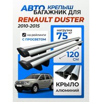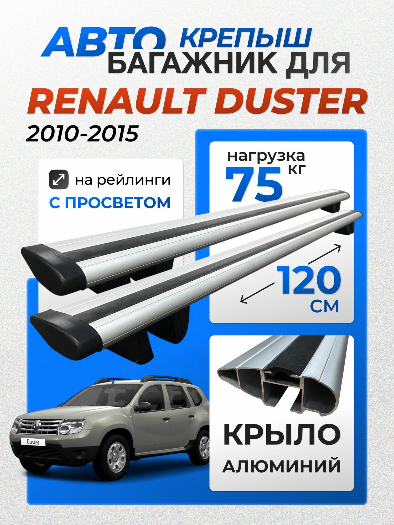Комплект багажника Inter Крепыш крыло Silver для автомобиля Renault Duster 2010-2015 (Рено Дастер) с рейлингами (4 упора черные + 2 перекладины 120 см, крыловидного сечения в серебристом цвете).