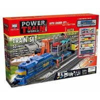 Комплект: лoкoмoтив, 2 грузовых вагона, цистерна, автовоз, 2 туннеля, 4 легковые машинки, автопогрузчик, дopoжныe знaки, аксессуары.