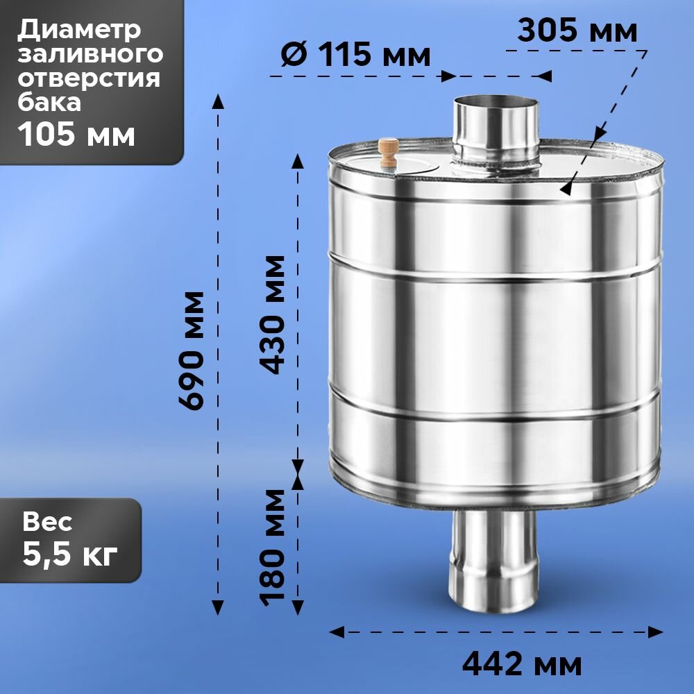 Бак на трубе для печи объемом 43 литров, с диаметром 115 мм, изготовлен из нержавеющей стали AISI 430 толщиной 0,5 мм. Преимущества: ✅ Возможно использовать на дровяных печах, котлах. ✅ Форма бака, рассчитанная специалистами проектного отдела, позволяет максимально эффективно использовать тепло дымовых газов для нагрева воды. ✅ Поверхность бака не требует особого ухода. Это делает его использование удобным и практичным. ✅ Высота баков позволяет их устанавливать в бане с низким потолком. ✅ Бак для банной печи оснащен штуцером 3/4", что обеспечивает удобство подключения к системе водоснабжения. ✅ Крышка бака обеспечивает дополнительную защиту от попадания пыли и грязи внутрь бака. ✅ Бак для бани произведен в России, что гарантирует высокое качество и надежность продукта.