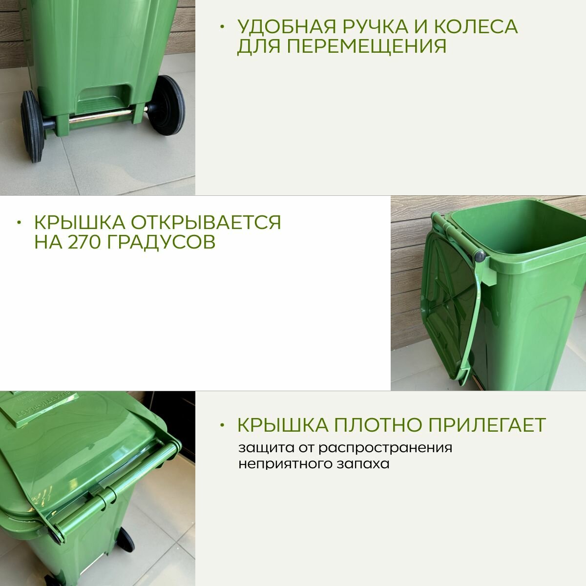 Бак изготовлен из высококачественного пластика, который обеспечивает долгий срок службы и защиту от непогоды. Он также оснащен механическим механизмом открывания, что позволяет легко загружать и выгружать мусор без лишних усилий.
