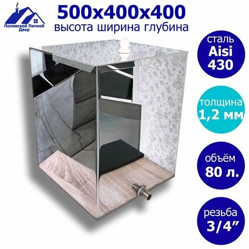 Бак для печи в баню из нержавеющей стали. Нержавеющая сталь AISI 430 является магнитной с умеренной стойкостью к коррозии, если у вас агрессивная по составу вода, могут появиться следы ржавчины и это не значит, что бак проржавеет насквозь и вода будет жёлтая от ржавчины. Обычно швы просто темнеют. Если есть подозрение на агрессивный состав воды, лучше перестраховаться и выбрать бак из нержавейки марки Aisi 201, а ещё лучше Aisi 304. Ёмкость (объём) - 80 литров. Высота - 500 мм, ширина - 400 мм, глубина - 400 мм. Штуцер 3/4". Материал: сталь нержавеющая толщиной 1,2 мм Aisi 430. Собственное производство. Полевской Печной двор. Особенности:Прочность: нержавеющая сталь обладает высокой прочностью и устойчивостью к механическим воздействиям, что гарантирует долгий срок службы бака.Экологичность: нержавеющая сталь является экологически чистым материалом, безопасным для здоровья человека. Вместимость: размеры и форма бака могут быть разными и зависят от ваших потребностей, но обычно они достаточно вместительны для хранения необходимого количества воды.Универсальность: такие баки для бани подходят для установки как внутри, так и снаружи бани, в зависимости от ваших предпочтений и требований. Эстетичный внешний вид: нержавеющая сталь имеет современный и стильный внешний вид, который гармонично сочетается с любым интерьером бани.