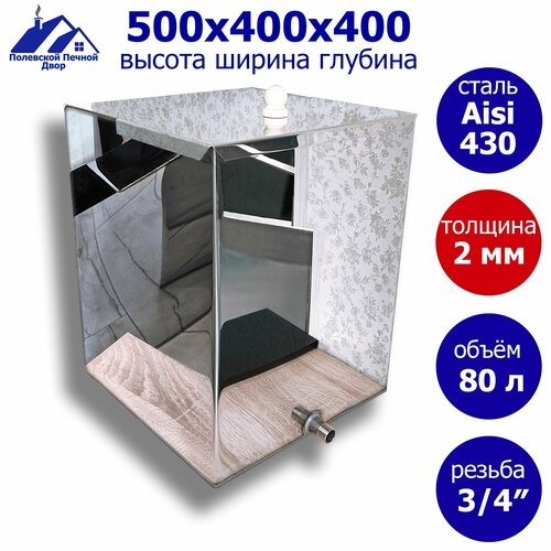 Бак для печи в баню из нержавеющей стали. Нержавеющая сталь AISI 430 является магнитной с умеренной стойкостью к коррозии, если у вас агрессивная по составу вода, могут появиться следы ржавчины и это не значит, что бак проржавеет насквозь и вода будет жёлтая от ржавчины. Обычно швы просто темнеют. Если есть подозрение на агрессивный состав воды, лучше перестраховаться и выбрать бак из нержавейки марки Aisi 201, а ещё лучше Aisi 304. Ёмкость (объём) - 80 литров. Высота - 500 мм, ширина - 400 мм, глубина - 400 мм. Штуцер 3/4". Материал: сталь нержавеющая толщиной 2 мм Aisi 430. Собственное производство. Полевской Печной двор. Особенности:Прочность: нержавеющая сталь обладает высокой прочностью и устойчивостью к механическим воздействиям, что гарантирует долгий срок службы бака.Экологичность: нержавеющая сталь является экологически чистым материалом, безопасным для здоровья человека. Вместимость: размеры и форма бака могут быть разными и зависят от ваших потребностей, но обычно они достаточно вместительны для хранения необходимого количества воды.Универсальность: такие баки для бани подходят для установки как внутри, так и снаружи бани, в зависимости от ваших предпочтений и требований. Эстетичный внешний вид: нержавеющая сталь имеет современный и стильный внешний вид, который гармонично сочетается с любым интерьером бани.