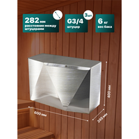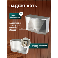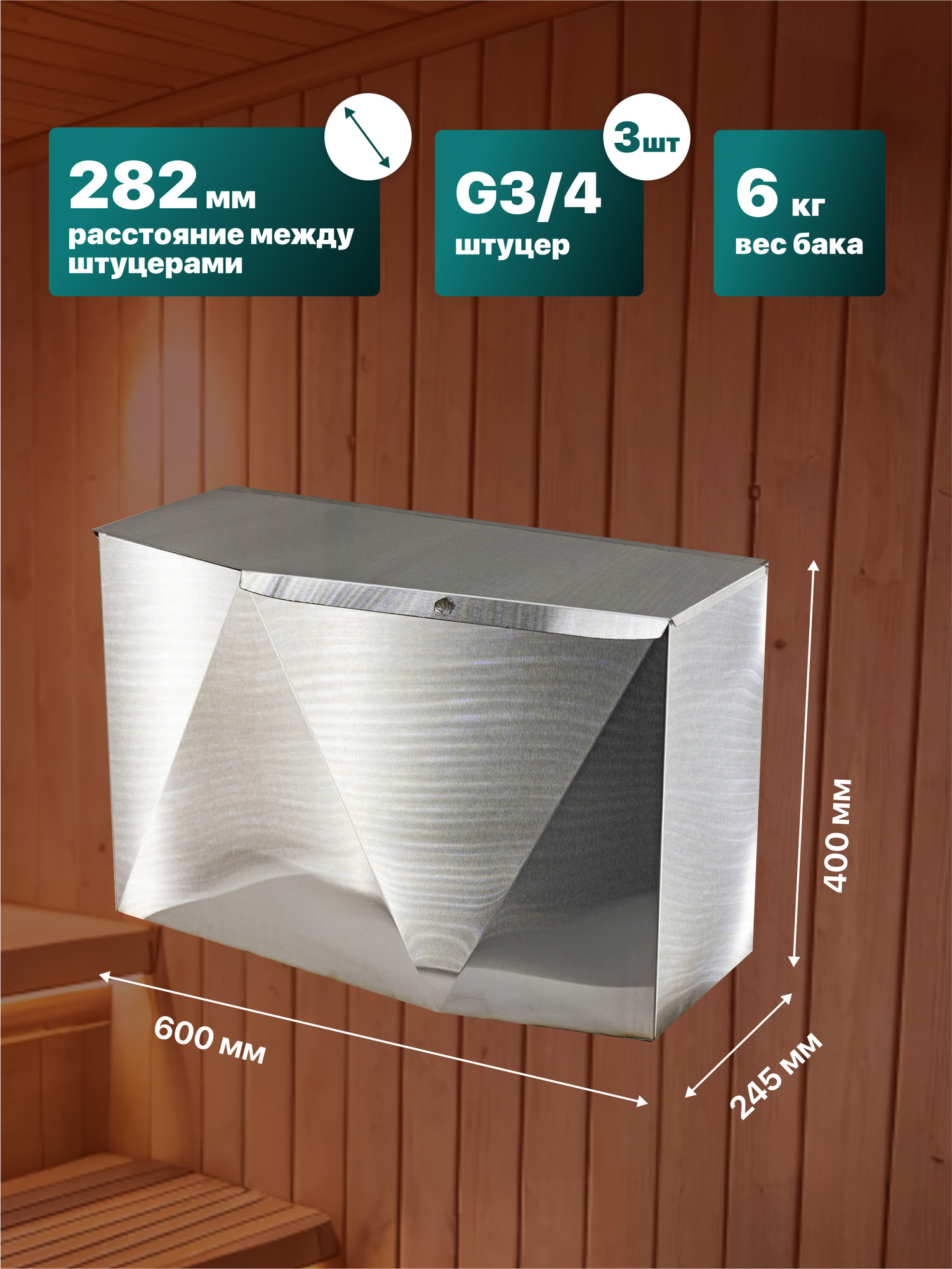 Бак для теплообменника для бани Сталь Мастер, выносной горизонтальный Diamond 65 л. - современная стильная линейка баков для бани, выделяется своим привлекательным дизайном, нержавеющей сталью AISI 201 толщиной 0,8 мм, а так же тем, что вместо приваренных патрубков используются латунные врезки с контргайкой. Металлическая емкость из нержавеющей стали предназначена для использования в бане. Она является удобным и выносным резервуаром, который можно установить в парной или моечном помещении. Благодаря этой емкости, запас горячей воды всегда будет под рукой для комфортного пребывания в бане. Бак может использоваться совместно с теплообменником для более эффективного нагрева воды. Бак для воды металлический из нержавейки идеально подходит как для каменки бани, так и для парной – его удобно разместить на печи или трубе. Устройство баков несложное: сверху имеется заливная горловина, в дне 3 легкозаменяемых патрубка – штуцера G3/4, посредством которого вода может сливаться, заливаться, и переливаться в случаи необходимости. Бак имеет 3 крепёжных «уха», на задней стенке, индивидуальное крепление с помощью, которого может быть установлен на стену. Один лишь взгляд на бак для воды «Diamond» с таким необычным дизайнерским решением вызывает ассоциации с настоящим бриллиантом. Бак «Diamond» будет свежо смотреться в интерьере любой бани, а так же служить долгое время, благодаря нержавеющей стали AISI 201 толщиной 0,8 мм. Латунная врезка с контргайкой 3/4 при необходимости может быть легко заменена. Высота 400 мм. Ширина 600 мм. Глубина 245 мм. Объем бака 65 л. Масса 6 кг.