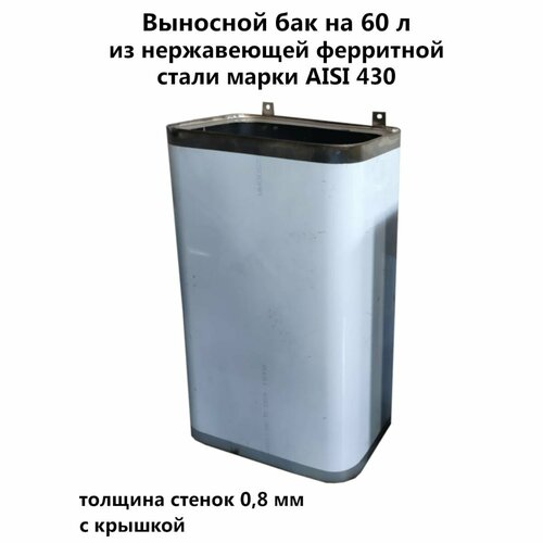 Бак для бани выносной 60 л от производителя «Вятская Печная Компания». Бак для воды в баню изготовлен из нержавеющей ферритной стали марки AISI 430 толщиной 0,8 мм. Бак выносной вешается на стену бани, моечной. Бак для бани из нержавейки имеет два ушка для крепления. Бак из нержавейки подходит для горячей и холодной воды. Нагрев воды в выносном баке осуществляется с помощью теплообменника встроенного в печь. В нижней части каждый бак из нержавейки для бани оборудован двумя отверстиями для подсоединения с теплообменником. Бак для бани укомплектован 2 штуцерами 3/4 (20). Достоинства наших баков: - углубленное донышко с ребрами жесткости, при нагревании бак не искажается и сохраняет свою геометрию; - ребро жесткости по высоте бака, при нагревании бак не искажается и сохраняет свою геометрию; - скругленные углы. Пополнение водой осуществляется через верхнюю часть бака. Бак в баню со съёмной крышкой. Поверхность шлифованная нержавейка. Основное преимущество выносного бака в том, что его можно располагать в любой части бани. А также выносные баки для бани могут быть большого объёма, в отличие от навесных баков для печей. Размер: (ВхШхГл) 625х375х250 мм. Выносные баки из нержавеющей ферритной стали марки AISI 430 представлены объёмами 45 л (название товара - Бак для воды в баню 1ВПК нержавейка 45 л ) , 60 л (название товара - Бак для воды в баню 1ВПК нержавейка 60 л ), 70 л (название товара - Бак для воды в баню 1ВПК нержавейка 70 л). Выносные баки из нержавеющей пищевой стали марки AISI 304 представлены объёмами 45 л (название товара - Бак для воды в баню 1ВПК нержавейка 45 л) , 60 л (название товара - Бак для воды в баню 1ВПК нержавейка 60 л) , 70 л (название товара - Бак для воды в баню 1ВПК нержавейка 70 л ), 100 л (название товара - Бак для воды в баню 1ВПК нержавейка 100 л), 120 л (название товара - Бак для воды в баню 1ВПК нержавейка 120 л).