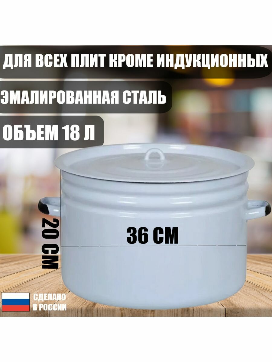 /Важно: технология окрашивания изделия, представляет собой окрашивание на иголках, поэтому на дне изделия с внешней стороны остаются точки и выемки что не является производственным браком - а лишь особенностью завода изготовителя./Бак-кастрюля 18 литра предназначена для приготовления различных блюд, напитков, маринования и засолки. Кастрюля изготовлена из стали и покрыта эмалью, которая соответствует требования ГОСТ 24788-2001. Эмаль устойчива к высоким температурам, механическому воздействию и не вступает в реакцию с продуктами. Важным преимуществом эмалированной посуды является устойчивость к кислотам, благодаря чему ее можно использовать для маринования и засолки продуктов./Бак оснащен двумя металлическими ручками и металлической крышкой с ручкой. Специальная форма горла кастрюли препятствует выкипанию жидкости и способствует осадку пенки./Технические характеристики:/Тип: кастрюля/Объем: 18 литра/Диаметр: 36 см/Материал изготовления: сталь/Эмалированное покрытие соответствует ГОСТ 24788-2001/Крышка из стали/Габаритные размеры: 37х37х20 см/Вес: 2 кг/