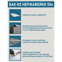 Использование металла толщиной 1 мм гарантирует высокую прочность конструкции и устойчивость к механическим воздействиям. Для дополнительной безопасности бак оснащен подвесной петлей с бесшовным соединением. Все сварные швы прошли процесс химической пассивации, что обеспечивает дополнительную защиту от коррозии и продлевает срок службы бака.