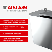 Бак изготовлен из нержавеющей стали AISI 439 толщиной 1,0 мм. Благодаря содержанию Титана и Хрома в составе марки AISI 439, сталь отличается высокой жаростойкостью и устойчивостью к коррозионному воздействию. Гарантируя надежность и долговечность изделия.