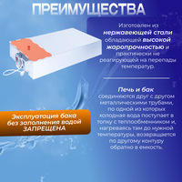 Бак из нержавеющей стали 0,8 мм используется как накопительная емкость для нагрева воды для душа и прочих потребностей. Имеет 3 патрубка- сливной, переливной, и наливной. ТЭН позволяет регулировать температуру нагрева, а так же поддерживать установленную температуру за счет встроенного в ТЭН термостата. Объем 110 литров, изготовлен из нержавеющей стали 0,8 мм AISI 439.