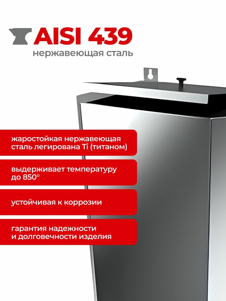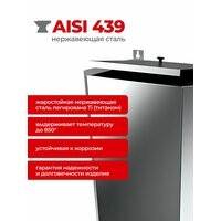 Бак изготовлен из нержавеющей стали AISI 439 толщиной 1,0 мм. Благодаря содержанию Титана и Хрома в составе марки AISI 439, сталь отличается высокой жаростойкостью и устойчивостью к коррозионному воздействию. Гарантируя надежность и долговечность изделия.