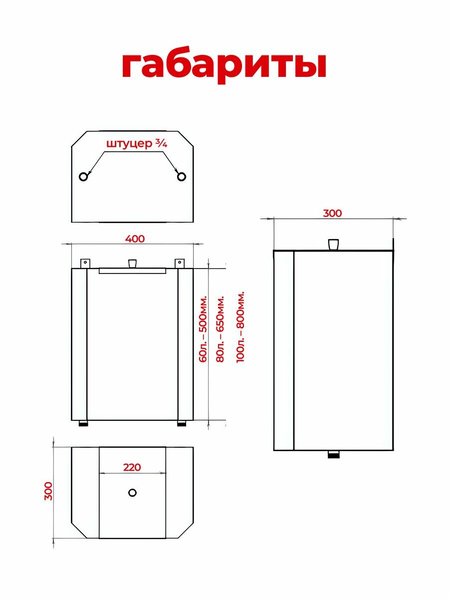 Бак оснащен двумя штуцерами 3/4. Легко устанавливается и подходит для различных типов банных печей.