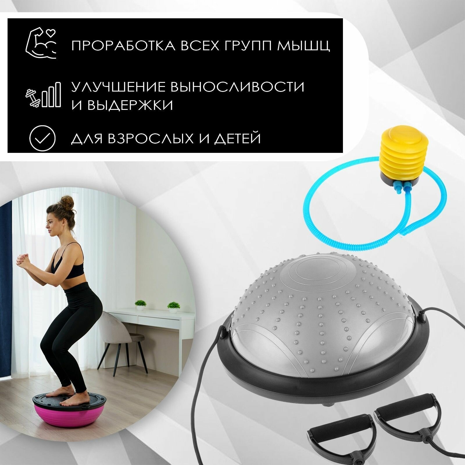 Подходит для взрослых и детей с любым уровнем физической подготовки. Но новичкам не рекомендуются тренировки на плоской стороне сферы. Без дополнительной подготовки нужно заниматься под присмотром тренера. Рекомендуем приступать к упражнениям только после разминки или растяжки, иначе можно повредить мышцы.