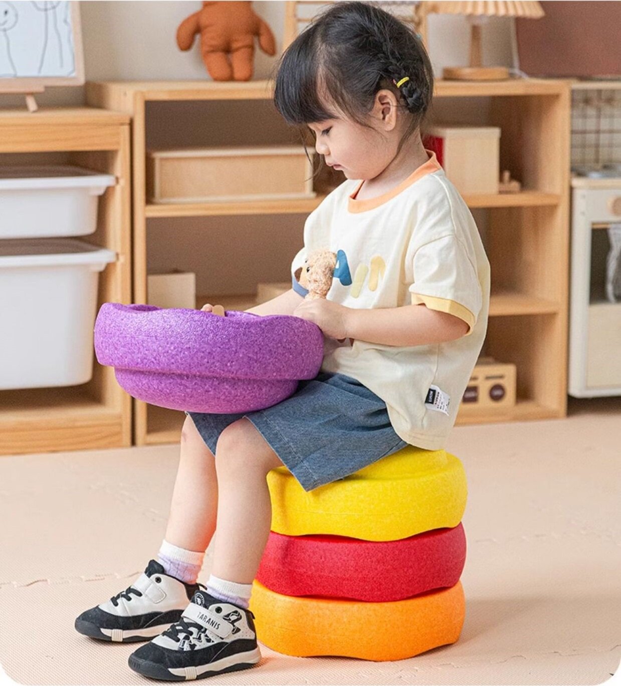 В процессе свободной игры дети активно бегают, прыгают, двигаются, строят разные фигуры из полусфер, сортируют, переносят предметы. Вес полусфер настолько мал, что даже самые маленькие с легкость справляются в игровой зоне.