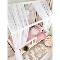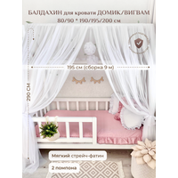 Балдахин с помпонами из мягкого, нежного стрейч фатина (не путать с жестким еврофатином) отличается изысканным дизайном, поможет создать в детской комнате легкую атмосферу уюта и красоты. Балдахин фиксируется с помощью текстильных лент крепления к боковой перекладине кроватки-домика. Состав: стрейч фатин (мелкая сетка). Размер L: длина 2.90 м, ширина 1.95 м (9м в сборке - 6 полос по 1,5 метра шириной). Подойдет для кроватей со спальным местом 80/90 * 190/195/200 см. Рекомендации по уходу: ручная или машинная стирка, деликатный режим, 30С, на минимальных оборотах отжима. Гладить на низких температурах или отпаривание.