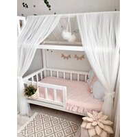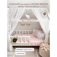 Балдахин с помпонами из мягкого, нежного стрейч фатина (не путать с жестким еврофатином) отличается изысканным дизайном, поможет создать в детской комнате легкую атмосферу уюта и красоты. Балдахин фиксируется с помощью текстильных лент крепления к боковой перекладине кроватки-домика. Состав: стрейч фатин (мелкая сетка). Размер L: длина 2.90 м, ширина 1.95 м (9м в сборке - 6 полос по 1,5 метра шириной). Подойдет для кроватей со спальным местом 80/90 * 190/195/200 см. Рекомендации по уходу: ручная или машинная стирка, деликатный режим, 30С, на минимальных оборотах отжима. Гладить на низких температурах или отпаривание.