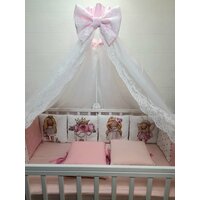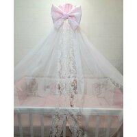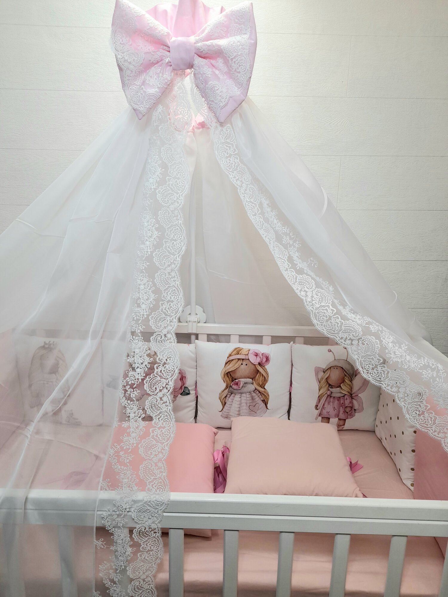Балдахин выполнен из поплина - натурального и гипоаллергенного материала, который обеспечивает комфорт и безопасность для нежной кожи ребенка. Вуаль розового цвета с кружевным узором и хлопковая шапочка с бантом создают нежный и приятный на ощупь образ.