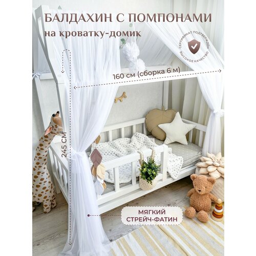 Балдахин с помпонами из мягкого, нежного стрейч фатина (не путать с жестким еврофатином) отличается изысканным дизайном, поможет создать в детской комнате легкую атмосферу уюта и красоты. Балдахин подойдет для кровати-домика со спальным местом 80/90*160 см. Он фиксируется с помощью текстильных лент крепления к боковой перекладине кроватки-домика. Состав: стрейч фатин (мелкая сетка). Размер М: длина 2.45 м, ширина 1,6 м (6м в сборке - 4 полосы по 1,5 метра шириной). Рекомендации по уходу: ручная или машинная стирка, деликатный режим, 30С, на минимальных оборотах отжима. Гладить на низких температурах или отпаривание.