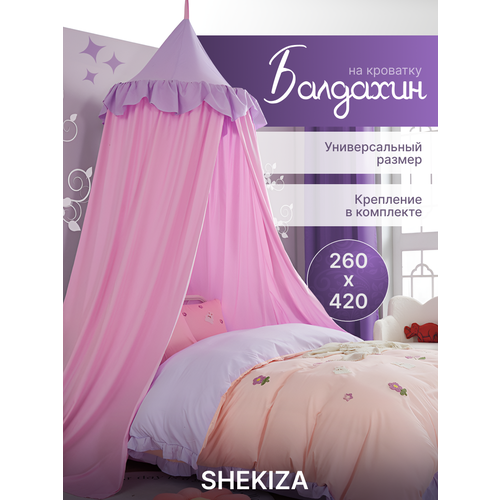 Данный шатер-балдахин очень легкий и мягкий, так как изготовлен из вискозы - нежной на ощупь, тонкой, шелковистой ткани. Общая высота шатра вместе с креплениями достигает 3 метров, включая корону в украшении. В балдахин вшит обруч, в комплект входит также крепление. Длина балдахина составляет 260 см (без шнурка), ширина 420 см, а диаметр купола 65 см.