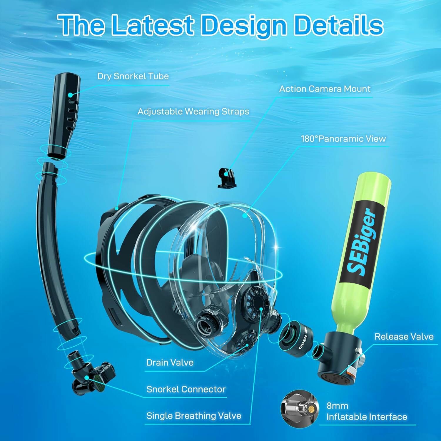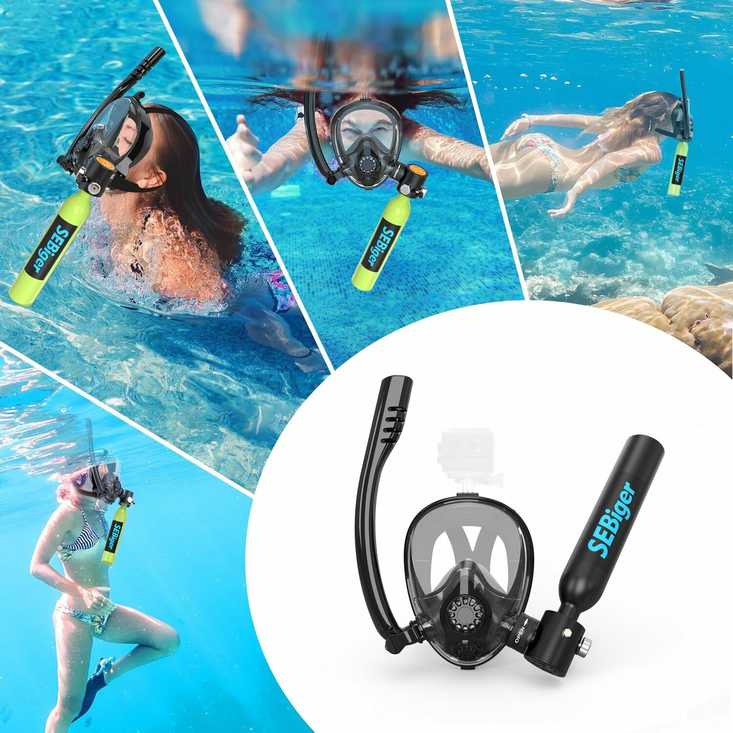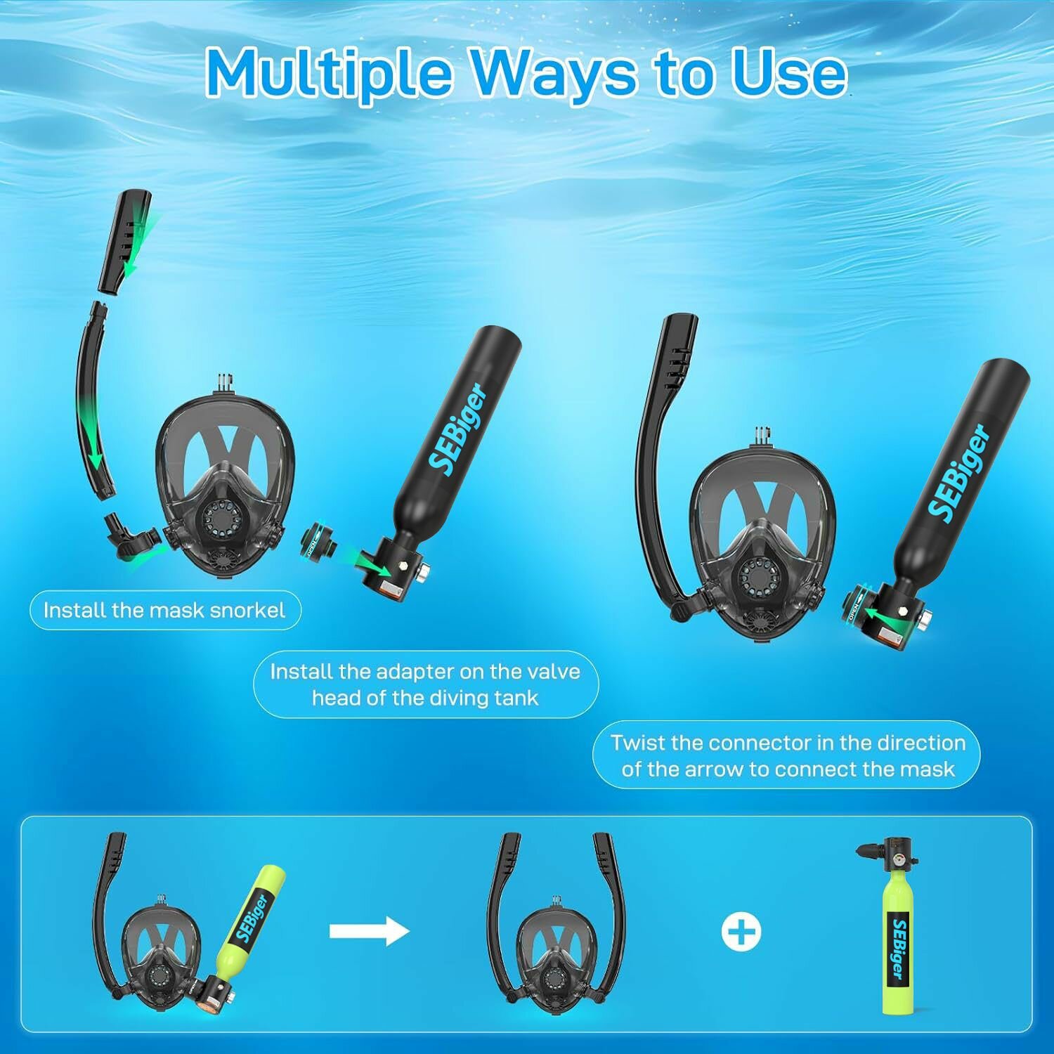 Вы можете как подключить два шноркеля для снорклинга, так и подключить баллоны для подводного плавания (только поддержка подключения к 0,5 л мини баллонов для подводного плавания, нужен разъем K2). При использовании для снорклинга, он действует как полное лицо маска для дайвинга, которая поддерживает дыхание через нос, что делает подводное плавание так же легко, как снорклинг (Примечание: при использовании для подводного плавания, максимальная глубина погружения не должна превышать 10 м)