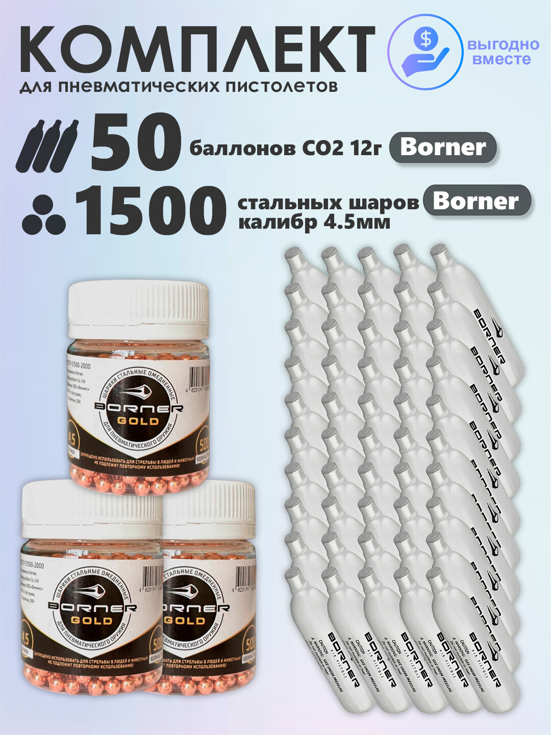 Купить Баллончики CO2 50 шт Borner и шарики 1500 шт Borner набор для пневматики с доставкой по всей России. Баллончики CO2 50 шт Borner и шарики 1500 шт Borner набор для пневматики: сравнение цен, характеристики, фото, актуальное наличие и цены.