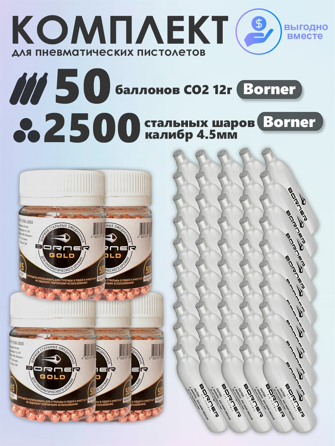 Купить Баллончики CO2 50 шт Borner и шарики 2500 шт Borner набор для пневматики с доставкой по всей России. Баллончики CO2 50 шт Borner и шарики 2500 шт Borner набор для пневматики: сравнение цен, характеристики, фото, актуальное наличие и цены.