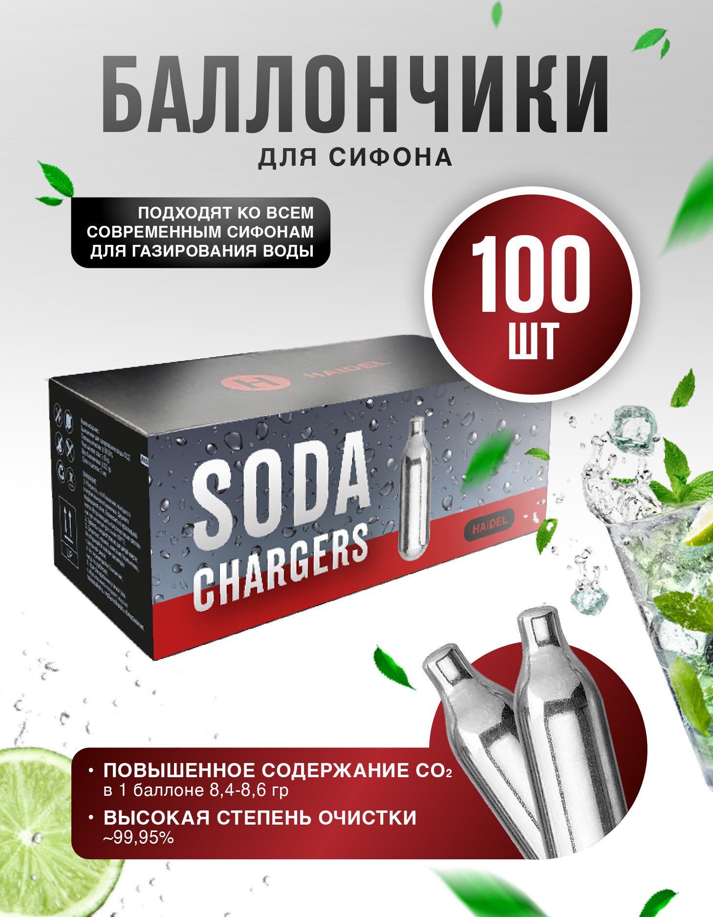 Баллончики для сифона CO2 (100 штук). Предназначены для газирования воды, а также приготовления лимонадов, коктейлей и других газированных напитков в сифонах.