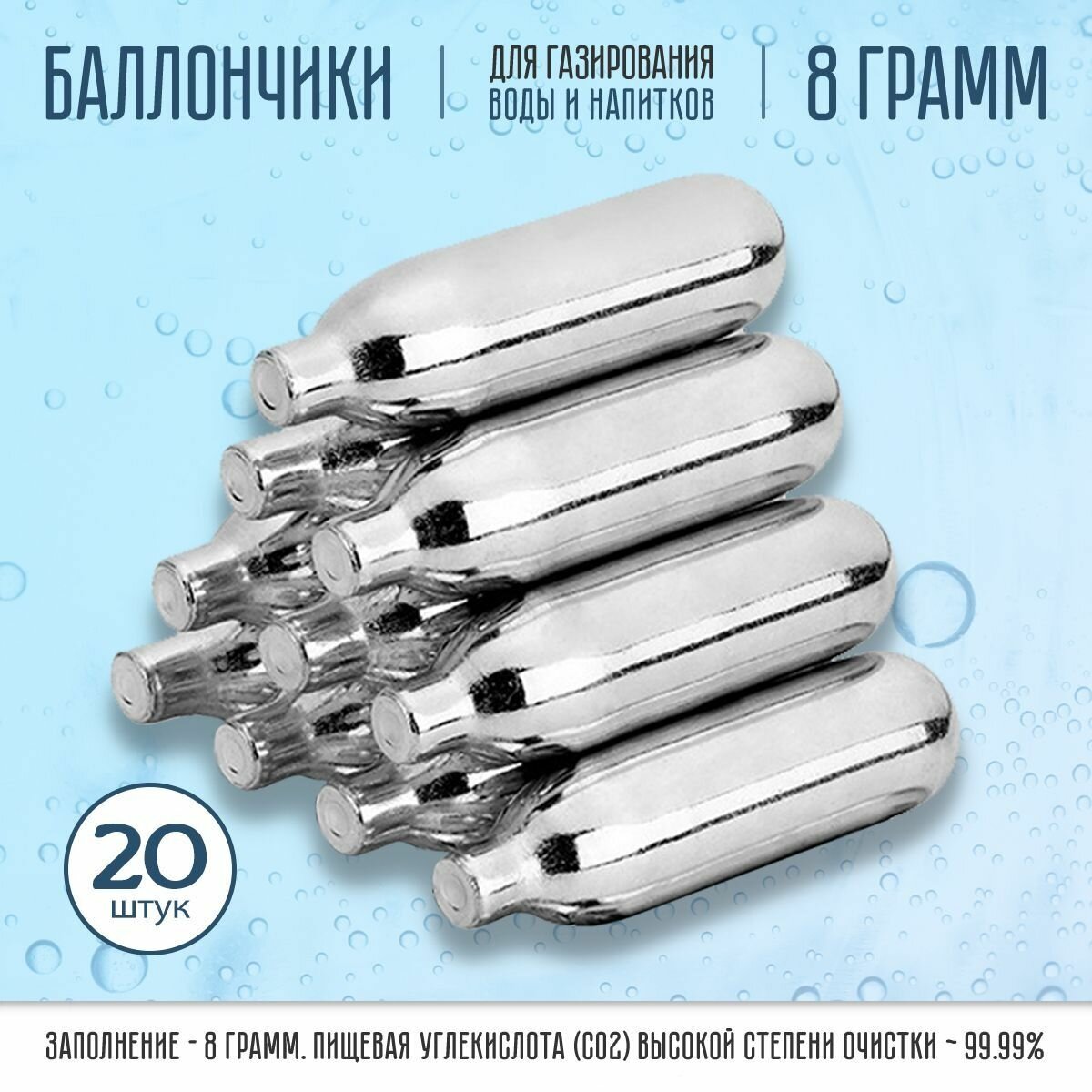 Данные баллончики заправлены пищевым негорючим углекислым газом CO2 высокой степени очистки (~99.99%). Баллончик обеспечивает более высокий уровень газации воды, т. к. заполнение газом = 8 грамм. Один баллончик рассчитан на приготовление ~ 1 литра газированной воды. Без химии и ГМО.