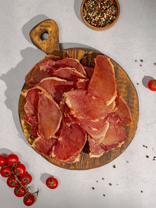 Балык хамон - это мясные чипсы свиные в лотке, которые представляют собой 100% натуральное вяленое мясо. В составе продукта только мясо свинины, соль и специи, без добавления сахара, усилителей вкуса и консервантов. Балык хамон отличается высоким содержанием белка (53 г на 100 г продукта) и отсутствием углеводов, что делает его отличным выбором для людей, ведущих активный образ жизни. Продукт подходит для перекуса на работе, в школе или институте, а также в качестве закуски к вину, пиву или выдержанным напиткам. Балык хамон станет отличным подарком для мужчин, женщин и детей. Он может быть использован в качестве закуски к вину, пиву или выдержанным напиткам, а также как самостоятельный перекус. Продукт не содержит искусственных красителей, что делает его безопасным для здоровья. В упаковке содержится 500 грамм вяленого мяса, что позволяет насладиться продуктом большой дружной компании или подарить его близким и друзьям. Балык хамон - это не только вкусный, но и полезный продукт, который станет отличным дополнением к вашему столу или подарком для близких.