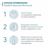 | Способ применения | один или два раза в день-7 дней в неделю, можно применять ежедневно, нанесите Atoderm Intensive Baume на лицо и/или тело после очищения и легкой сушки |