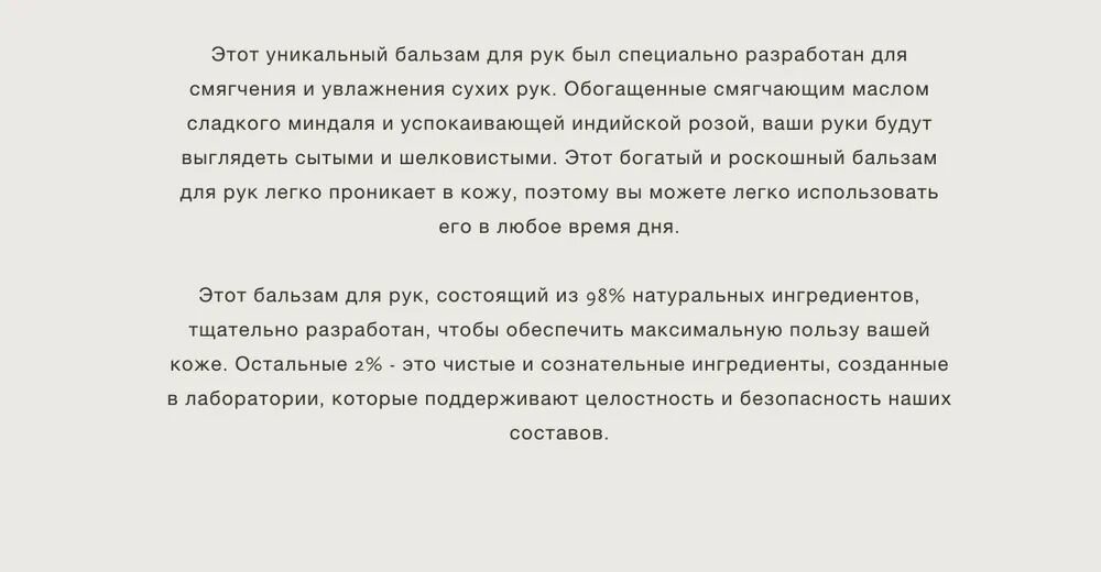 | Способ применения | Наносите этот насыщенный крем каждый день и втирайте его в кожу. Используйте в сочетании с продуктами для ванны или душа для усиления аромата. |
