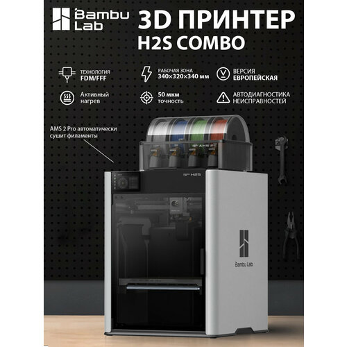 Представляем Bambu Lab H2S AMS Combo — новый стандарт в мире настольной 3D-печати, который поднимает планку качества, скорости и возможностей. Это не просто принтер, это полноценная производственная станция, идеальная для дизайнеров, инженеров, хобби-мастеров и малых мастерских, которым важно делать сложные, крупные и качественные детали без компромиссов.
