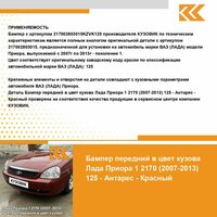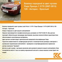 Бампер передний в цвет кузова Лада Приора 1 (2007-2013) 125 - Антарес - Красный. Новый бампер, окрашен в цвет вашего автомобиля с гарантией! Окраска кузовных деталей производится в заводских условиях по ГОСТ 9.032-74. Бампер в цвет кузова - выгодное решение для кузовного ремонта вашего автомобиля. Вам понадобится всего 2 часа на замену детали и ваша машина снова будет как новая! Цвет бампера соответствует оригинальному заводскому коду краски по классификации автомобильной марки лада: 125 - Антарес - Красный. Бампер передний с артикулом 217002803015KZVK125 производителя " Кузовик" по техническим характеристикам является полным аналогом оригинальной детали с артикулом 217002803015, предназначенной для установки на автомобиль марки Лада модели Приора, выпускаемой с 2007 г. по 2013 г. Крепежные элементы и отверстия на детали совпадают с кузовными параметрами автомобиля Лада Приора, совместимость проверена в сервисном центре компании " Кузовик". Если вы не нашли бампера в цвет для вашего автомобиля в каталоге, напишите нам, сделайте заявку на производство и уже в ближайшее время вы сможете купить его на Маркетплейсе. Остались вопросы? Мы онлайн! Напишите нам сообщение и мы с удовольствием проконсультируем вас!