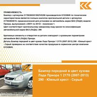 Бампер передний в цвет кузова Лада Приора 1 (2007-2013) 290 - Южный крест - Серый. Новый бампер, окрашен в цвет вашего автомобиля с гарантией! Окраска кузовных деталей производится в заводских условиях по ГОСТ 9.032-74. Бампер в цвет кузова - выгодное решение для кузовного ремонта вашего автомобиля. Вам понадобится всего 2 часа на замену детали и ваша машина снова будет как новая! Цвет бампера соответствует оригинальному заводскому коду краски по классификации автомобильной марки лада: 290 - Южный крест - Серый. Бампер передний с артикулом 217002803015KZVK290 производителя " Кузовик" по техническим характеристикам является полным аналогом оригинальной детали с артикулом 217002803015, предназначенной для установки на автомобиль марки Лада модели Приора, выпускаемой с 2007 г. по 2013 г. Крепежные элементы и отверстия на детали совпадают с кузовными параметрами автомобиля Лада Приора, совместимость проверена в сервисном центре компании " Кузовик". Если вы не нашли бампера в цвет для вашего автомобиля в каталоге, напишите нам, сделайте заявку на производство и уже в ближайшее время вы сможете купить его на Маркетплейсе. Остались вопросы? Мы онлайн! Напишите нам сообщение и мы с удовольствием проконсультируем вас!
