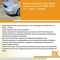 Бампер передний в цвет кузова Лада Приора 1 (2007-2013) 411 - Ладога - Голубой. Новый бампер, окрашен в цвет вашего автомобиля с гарантией! Окраска кузовных деталей производится в заводских условиях по ГОСТ 9.032-74. Бампер в цвет кузова - выгодное решение для кузовного ремонта вашего автомобиля. Вам понадобится всего 2 часа на замену детали и ваша машина снова будет как новая! Цвет бампера соответствует оригинальному заводскому коду краски по классификации автомобильной марки лада: 411 - Ладога - Голубой. Бампер передний с артикулом 217002803015KZVK411 производителя " Кузовик" по техническим характеристикам является полным аналогом оригинальной детали с артикулом 217002803015, предназначенной для установки на автомобиль марки Лада модели Приора, выпускаемой с 2007 г. по 2013 г. Крепежные элементы и отверстия на детали совпадают с кузовными параметрами автомобиля Лада Приора, совместимость проверена в сервисном центре компании " Кузовик". Если вы не нашли бампера в цвет для вашего автомобиля в каталоге, напишите нам, сделайте заявку на производство и уже в ближайшее время вы сможете купить его на Маркетплейсе. Остались вопросы? Мы онлайн! Напишите нам сообщение и мы с удовольствием проконсультируем вас!