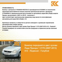 Бампер передний в цвет кузова Лада Приора 1 (2007-2013) 413 - Ледяной - Голубой. Новый бампер, окрашен в цвет вашего автомобиля с гарантией! Окраска кузовных деталей производится в заводских условиях по ГОСТ 9.032-74. Бампер в цвет кузова - выгодное решение для кузовного ремонта вашего автомобиля. Вам понадобится всего 2 часа на замену детали и ваша машина снова будет как новая! Цвет бампера соответствует оригинальному заводскому коду краски по классификации автомобильной марки лада: 413 - Ледяной - Голубой. Бампер передний с артикулом 217002803015KZVK413 производителя " Кузовик" по техническим характеристикам является полным аналогом оригинальной детали с артикулом 217002803015, предназначенной для установки на автомобиль марки Лада модели Приора, выпускаемой с 2007 г. по 2013 г. Крепежные элементы и отверстия на детали совпадают с кузовными параметрами автомобиля Лада Приора, совместимость проверена в сервисном центре компании " Кузовик". Если вы не нашли бампера в цвет для вашего автомобиля в каталоге, напишите нам, сделайте заявку на производство и уже в ближайшее время вы сможете купить его на Маркетплейсе. Остались вопросы? Мы онлайн! Напишите нам сообщение и мы с удовольствием проконсультируем вас!