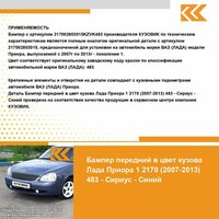 Бампер передний в цвет кузова Лада Приора 1 (2007-2013) 483 - Сириус - Синий. Новый бампер, окрашен в цвет вашего автомобиля с гарантией! Окраска кузовных деталей производится в заводских условиях по ГОСТ 9.032-74. Бампер в цвет кузова - выгодное решение для кузовного ремонта вашего автомобиля. Вам понадобится всего 2 часа на замену детали и ваша машина снова будет как новая! Цвет бампера соответствует оригинальному заводскому коду краски по классификации автомобильной марки лада: 483 - Сириус - Синий. Бампер передний с артикулом 217002803015KZVK483 производителя " Кузовик" по техническим характеристикам является полным аналогом оригинальной детали с артикулом 217002803015, предназначенной для установки на автомобиль марки Лада модели Приора, выпускаемой с 2007 г. по 2013 г. Крепежные элементы и отверстия на детали совпадают с кузовными параметрами автомобиля Лада Приора, совместимость проверена в сервисном центре компании " Кузовик". Если вы не нашли бампера в цвет для вашего автомобиля в каталоге, напишите нам, сделайте заявку на производство и уже в ближайшее время вы сможете купить его на Маркетплейсе. Остались вопросы? Мы онлайн! Напишите нам сообщение и мы с удовольствием проконсультируем вас!