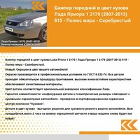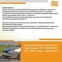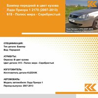 Бампер передний в цвет кузова Лада Приора 1 (2007-2013) 615 - Полюс мира - Серебристый. Новый бампер, окрашен в цвет вашего автомобиля с гарантией! Окраска кузовных деталей производится в заводских условиях по ГОСТ 9.032-74. Бампер в цвет кузова - выгодное решение для кузовного ремонта вашего автомобиля. Вам понадобится всего 2 часа на замену детали и ваша машина снова будет как новая! Цвет бампера соответствует оригинальному заводскому коду краски по классификации автомобильной марки лада: 615 - Полюс мира - Серебристый. Бампер передний с артикулом 217002803015KZVK615 производителя " Кузовик" по техническим характеристикам является полным аналогом оригинальной детали с артикулом 217002803015, предназначенной для установки на автомобиль марки Лада модели Приора, выпускаемой с 2007 г. по 2013 г. Крепежные элементы и отверстия на детали совпадают с кузовными параметрами автомобиля Лада Приора, совместимость проверена в сервисном центре компании " Кузовик". Если вы не нашли бампера в цвет для вашего автомобиля в каталоге, напишите нам, сделайте заявку на производство и уже в ближайшее время вы сможете купить его на Маркетплейсе. Остались вопросы? Мы онлайн! Напишите нам сообщение и мы с удовольствием проконсультируем вас!