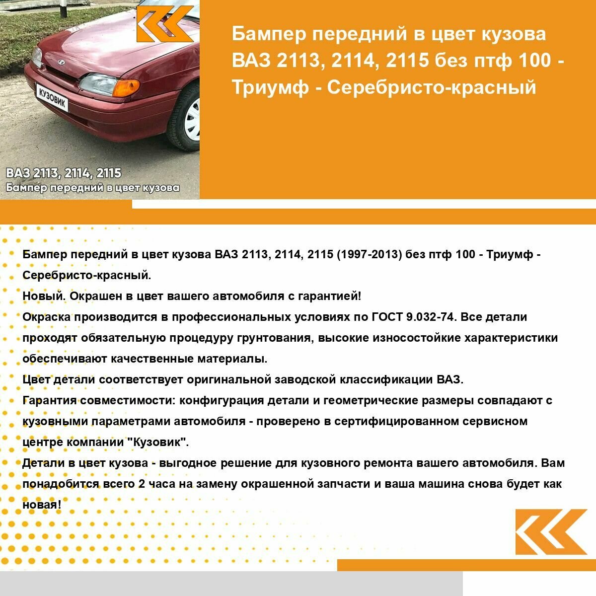 | Подробная комплектация | Бампер передний в цвет кузова ВАЗ 2113 2114 2115 без отверстий под противотуманные фары |
