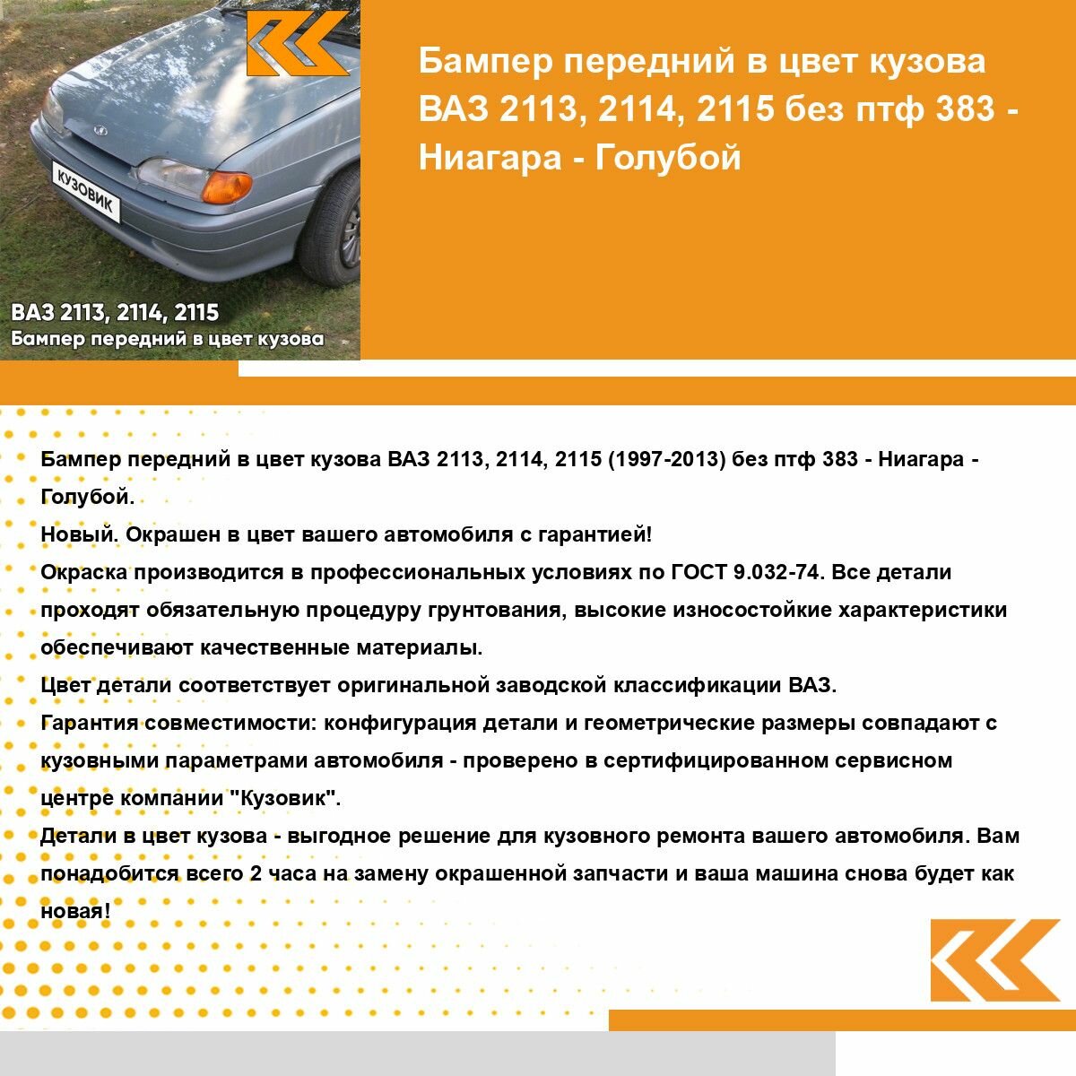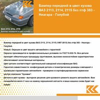 Бампер передний в цвет кузова ВАЗ 2114 2115 2113 без отверстий под противотуманные фары 383 - Ниагара - Голубой. Новый бампер, окрашен в цвет вашего автомобиля с гарантией! Окраска кузовных деталей производится компанией " Кузовик" в заводских условиях по ГОСТ 9.032-74. Бампер в цвет кузова - выгодное решение для кузовного ремонта вашего автомобиля. Вам понадобится всего 2 часа на замену детали и ваша машина снова будет как новая! Цвет бампера соответствует оригинальному заводскому коду краски по классификации автомобильной марки ВАЗ (лада): 383 - Ниагара - Голубой. Бампер передний с артикулом 211302803015KZVK383 производителя " Кузовик" по техническим характеристикам является полным аналогом оригинальной детали с артикулом 211302803015, предназначенного для установки на автомобиль марки ВАЗ 2113, 2114, 2115, выпускаемый с 2001г по 2013г. Крепежные элементы и отверстия на детали совпадают с кузовными параметрами автомобиля ВАЗ 2113, 2114, 2115, совместимость проверена в сервисном центре компании " Кузовик". Если вы не нашли бампера в цвет для вашего автомобиля в каталоге, напишите нам, сделайте заявку на производство и уже в ближайшее время вы сможете купить его на маркетплейсе. Остались вопросы? Мы онлайн! Напишите нам сообщение и мы с удовольствием проконсультируем вас!