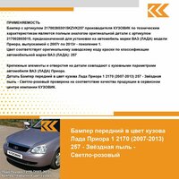 Бампер передний в цвет кузова Лада Приора 1 (2007-2013) 257 - Звёздная пыль - Светло-розовый. Новый бампер, окрашен в цвет вашего автомобиля с гарантией! Окраска кузовных деталей производится в заводских условиях по ГОСТ 9.032-74. Бампер в цвет кузова - выгодное решение для кузовного ремонта вашего автомобиля. Вам понадобится всего 2 часа на замену детали и ваша машина снова будет как новая! Цвет бампера соответствует оригинальному заводскому коду краски по классификации автомобильной марки лада: 257 - Звёздная пыль - Светло-розовый. Бампер передний с артикулом 217002803015KZVK257 производителя " Кузовик" по техническим характеристикам является полным аналогом оригинальной детали с артикулом 217002803015, предназначенной для установки на автомобиль марки Лада модели Приора, выпускаемой с 2007 г. по 2013 г. Крепежные элементы и отверстия на детали совпадают с кузовными параметрами автомобиля Лада Приора, совместимость проверена в сервисном центре компании " Кузовик". Если вы не нашли бампера в цвет для вашего автомобиля в каталоге, напишите нам, сделайте заявку на производство и уже в ближайшее время вы сможете купить его на Маркетплейсе. Остались вопросы? Мы онлайн! Напишите нам сообщение и мы с удовольствием проконсультируем вас!