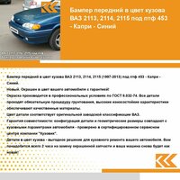 Бампер передний в цвет кузова ВАЗ 2114 2115 2113 с отверстиями под противотуманные фары 453 - Капри - Синий. Новый бампер, окрашен в цвет вашего автомобиля с гарантией! Окраска кузовных деталей производится в заводских условиях по ГОСТ 9.032-74. Бампер в цвет кузова - выгодное решение для кузовного ремонта вашего автомобиля. Вам понадобится всего 2 часа на замену детали и ваша машина снова будет как новая! Цвет бампера соответствует оригинальному заводскому коду краски по классификации автомобильной марки ВАЗ (лада): 453 - Капри - Синий. Бампер передний с артикулом 21152803015KZVK453 производителя " Кузовик" по техническим характеристикам является полным аналогом оригинальной детали с артикулом 21152803015, предназначенного для установки на автомобиль марки ВАЗ 2113, 2114, 2115, выпускаемый с 2001г по 2013г. Крепежные элементы и отверстия на детали совпадают с кузовными параметрами автомобиля ВАЗ 2113, 2114, 2115, совместимость проверена в сервисном центре компании " Кузовик". Если вы не нашли бампера в цвет для вашего автомобиля в каталоге, напишите нам, сделайте заявку на производство и уже в ближайшее время вы сможете купить его на маркетплейс. Остались вопросы? Мы онлайн на маркетплейс, напишите нам сообщение и мы с удовольствием проконсультируем вас!