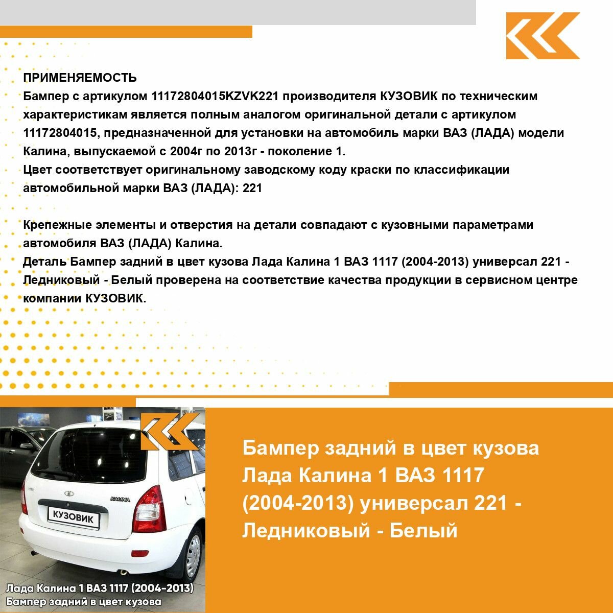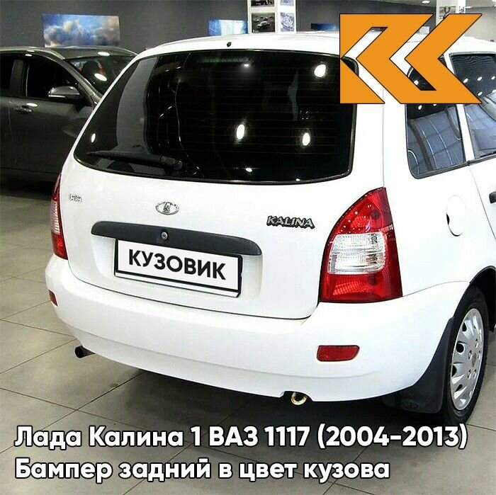 Бампер задний в цвет кузова Lada Kalina 1 / Лада Калина 1 универсал - ВАЗ 1117 (2004-2013) 221 - Ледниковый - Белый. Новый. Окрашен в цвет вашего автомобиля с гарантией. Окраска производится в профессиональных условиях по ГОСТ 9.032-74. Все детали проходят обязательную процедуру грунтования, высокие износостойкие характеристики обеспечивают качественные материалы. Цвет детали соответствует оригинальной заводской классификации Лада. Гарантия совместимости: конфигурация детали и геометрические размеры совпадают с кузовными параметрами автомобиля - проверено в сертифицированном сервисном центре компании Кузовик . Детали в цвет кузова - выгодное решение для кузовного ремонта вашего автомобиля.
